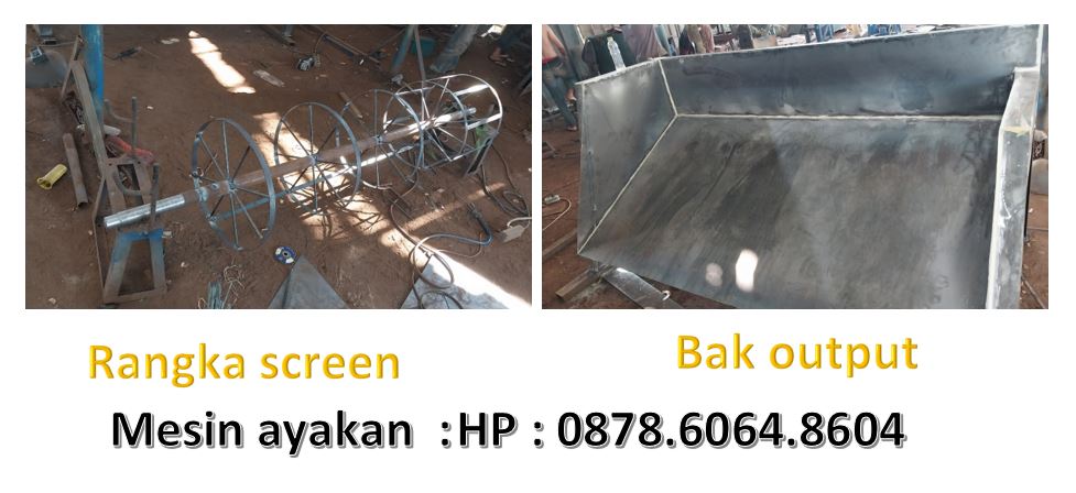 Material yang akan di ayak akan keluar dari screen yang sedang berputar dan jatuh tepat ke atas bak output . Bahan screen terbuat dari stainless steel sehingga tidak berkarat , adapun lubang screen bisa disesuaikan dengan kebutuhan konsumen . Untuk screen yang sedang kami buat ini memiliki lubang 5×5 mm .